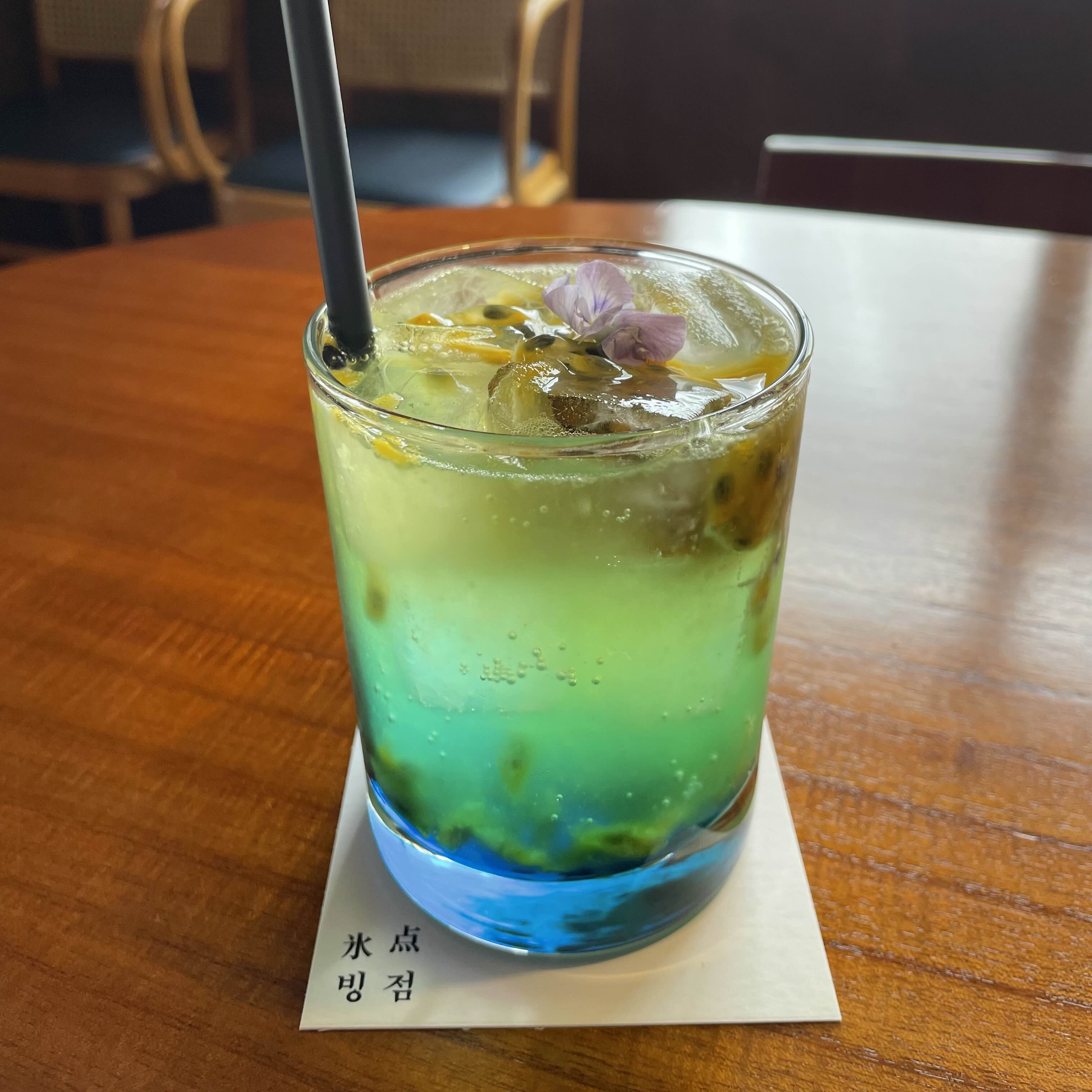 영롱한 색상에 한번 반하고, 잘 저어서 마시니 그 맛에 두번 반하는 오늘의 시그니처 메뉴